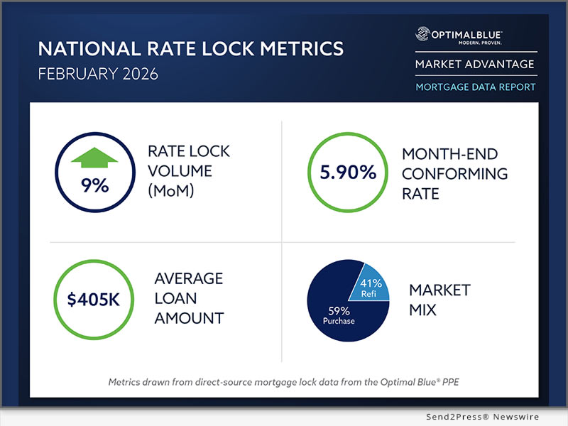 PLANO, Texas, March 10, 2026 (SEND2PRESS NEWSWIRE) — Optimal Blue today released its February 2026 Market Advantage mortgage data report, showing a meaningful improvement in lock activity as lower mortgage rates helped bring purchase borrowers back into the market. Total rate-lock volume rose 9% month over month (MoM) and was nearly 40% higher year over year (YoY).