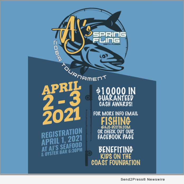 DESTIN, Fla. /ScoopCloud/ — It’s time to break out that fishing gear. AJ’s Seafood and Oyster Bar is hosting its Spring Fling Cobia Tournament from April 2-3, 2021. And, this year’s event benefits two of its favorite non-profits, the Destin Fishing Museum and Kids on the Coast Foundation. Proceeds from the tournament will be split between the two.