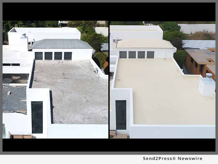 DANA POINT, Calif. /ScoopCloud/ — Repairing chronic roof leaks due to poor home construction without doing a tear-off or further construction takes innovation, ingenuity, skill, and in this case, the right product line up, says Pacific Roofing Systems. Pacific met the “construction-less” challenge to repair 2,000 square feet of spudded rock flat roofing and sloped metal roofing on a private Laguna Beach residence by instead proposing the use of a unique formulated monolithic liquid single-ply waterproof roof system known as the SureCoat Roof System.