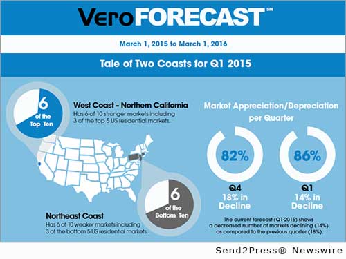 SANTA ANA, Calif., April 2, 2015 (SEND2PRESS NEWSWIRE) — Veros Real Estate Solutions (Veros), an award-winning industry leader in enterprise risk management, collateral valuation services and predictive analytics, reports that the residential market is gaining momentum with a greater percentage of markets expected to increase in value over the next 12 months, moving upwards to 86% from last quarter’s 82 percent.