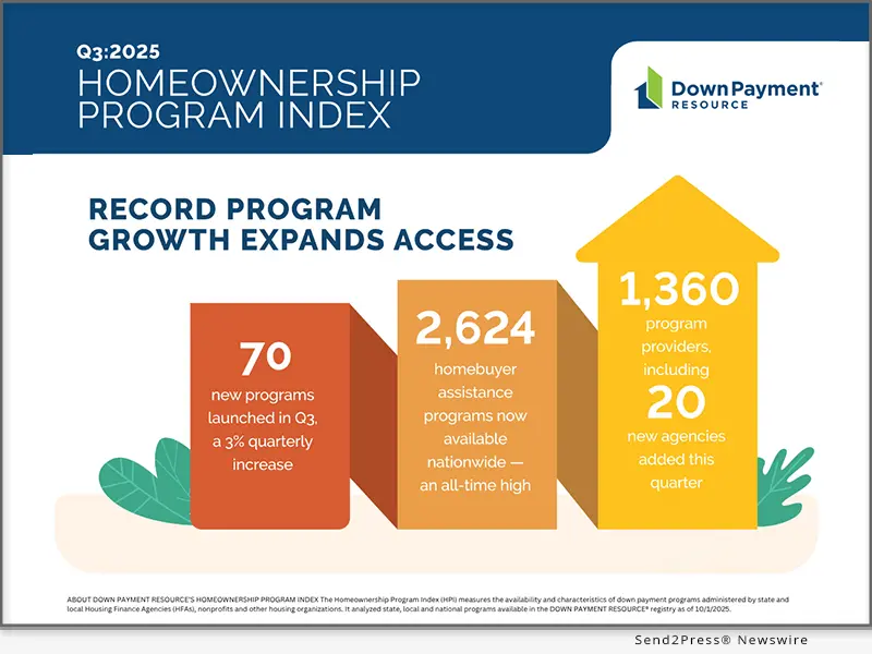 ATLANTA, Ga., Oct. 21, 2025 (SEND2PRESS NEWSWIRE) — Down Payment Resource (DPR), the housing industry authority on homebuyer assistance program data and solutions, today released its Q3 2025 Homeownership Program Index (HPI) report. The report identifies 70 new programs launched in Q3, bringing the total number of available programs nationwide to a record 2,624. Additionally, 20 new program providers were added to DPR’s database in Q3, bringing its provider total to 1,360.