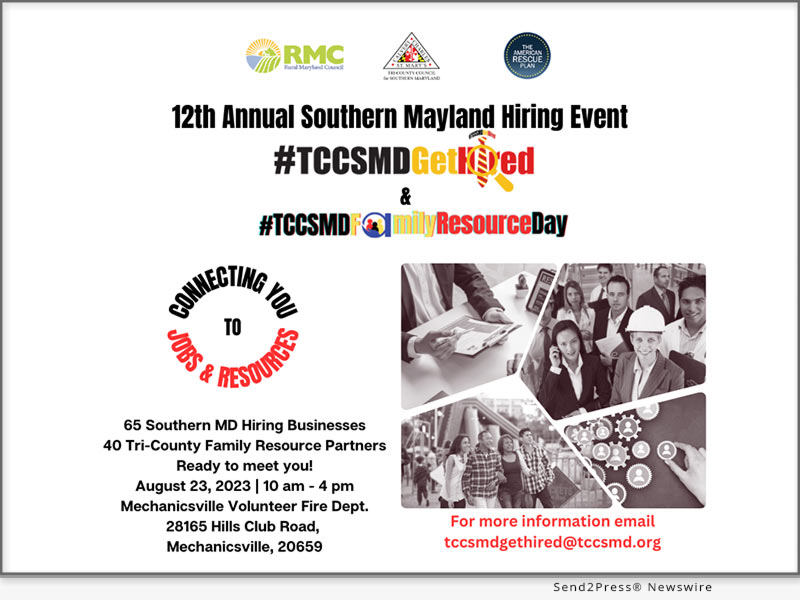 HUGHESVILLE, Md. /ScoopCloud/ — The Tri-County Council for Southern Maryland (TCCSMD) is pleased to announce the date for the region’s largest job fair, the 12th Annual “#TCCSMDGetHired” Hiring Event on August 23, 2023, at the Mechanicsville Volunteer Fire Department. New this year, the 1st Annual Family Resource Day will be featured, connecting families with important community resources.