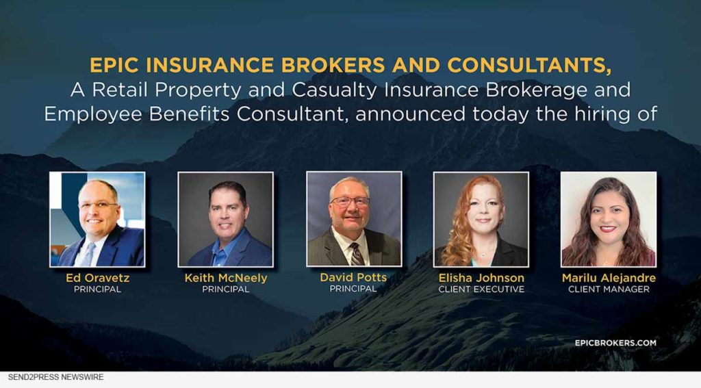 HOUSTON, Texas /ScoopCloud/ — EPIC Insurance Brokers and Consultants, a retail property and casualty insurance brokerage and employee benefits consultant, announced today the hiring of Principal Ed Oravetz, Principal Keith McNeely, Principal David Potts, Client Executive Elisha Johnson and Client Manager Marilu Alejandre.