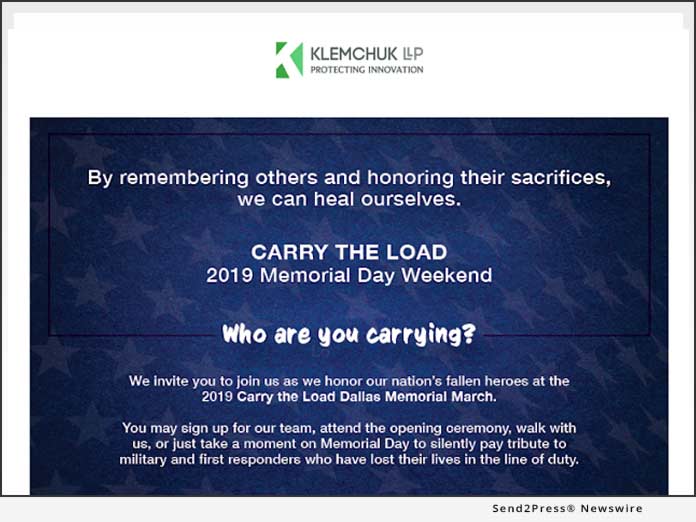 DALLAS, Texas /ScoopCloud/ — Klemchuk LLP, a leading litigation, intellectual property (IP), and business law firm, announces that Klemchuk LLP and Team Klemchuk will proudly participate in Carry the Load 2019 Dallas Memorial March over Memorial Day Weekend.
