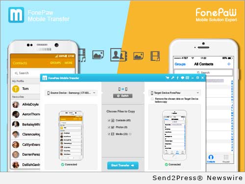 HONG KONG, China and NEW YORK, Aug. 12, 2015 (SEND2PRESS NEWSWIRE) — Many times, you curse the cumbersome ordeal of mobile data transfer and prepare to shake with fury. This time, you don’t have to just get a hammer, smash your phone and start over. FonePaw has launched a handy files migration tool called Mobile Transfer to help users transfer contacts, videos, photos and music from phone to phone with one click.