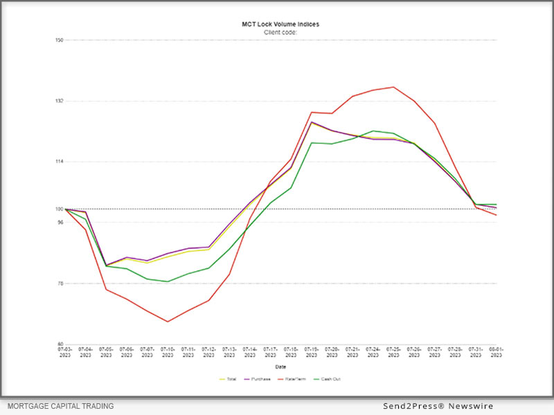 SAN DIEGO, Calif. /ScoopCloud/ — SAN DIEGO, Calif., Sept. 5, 2023 (SEND2PRESS NEWSWIRE) — Mortgage Capital Trading, Inc. (MCT®), a leading mortgage hedge advisory and secondary marketing software firm, reported today a slight 4.76% decline in mortgage lock volume over the prior month. The slight dip in mortgage lock volume is likely attributed to an increase in mortgage rates through the last month.