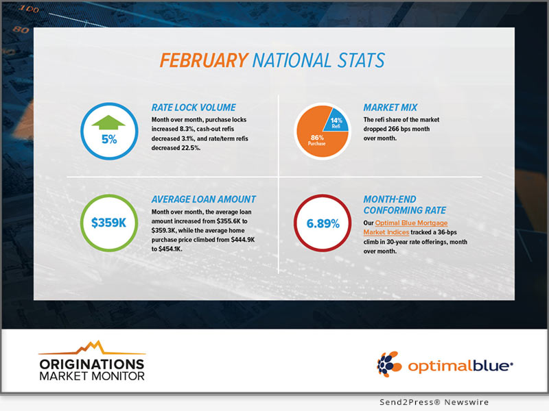 PLANO, Texas /ScoopCloud/ — Today, Optimal Blue announced the release of its Originations Market Monitor report, looking at mortgage origination data through January month-end. Leveraging daily rate lock data from the Optimal Blue PPE – the industry’s most widely used product, pricing, and eligibility engine – the Originations Market Monitor provides a comprehensive and timely view into origination activity.