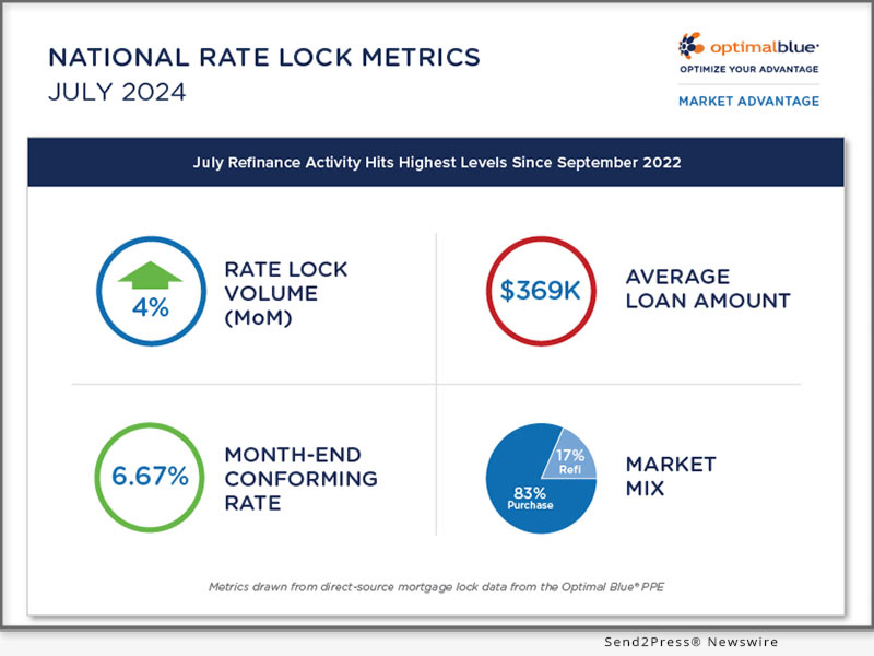 PLANO, Texas /ScoopCloud/ — Optimal Blue today released its July 2024 Market Advantage mortgage data report, which revealed that mortgage refinance demand surged to levels not seen since September 2022 amid softening interest rates. The lower interest rates seen in July also coaxed increased purchase activity, which, combined with greater refi activity, drove a 3.5% month-over-month (MoM) increase in mortgage rate lock volumes.