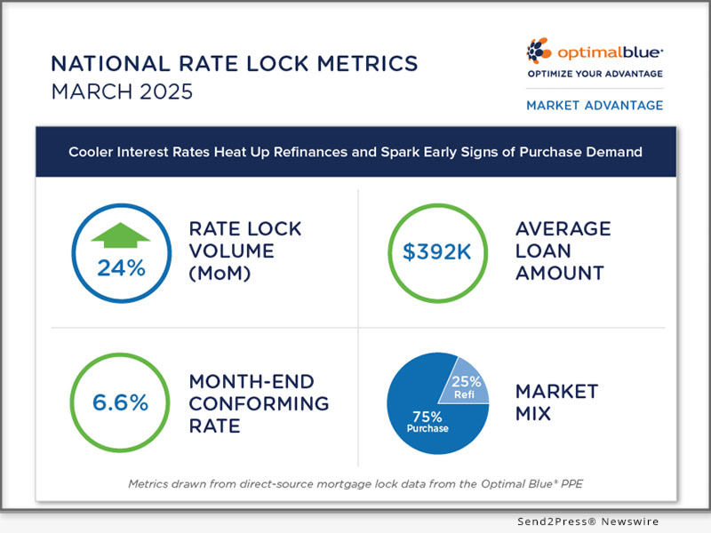 PLANO, Texas, April 8, 2025 (SEND2PRESS NEWSWIRE) — Optimal Blue today released its March 2025 Market Advantage mortgage data report, showing a 24% surge in rate lock volume as early spring buyers returned to the market and homeowners jumped at the chance to refinance into lower rates. While still down 2% on a year-over-year (YoY) basis, purchase volumes were up 21% month-over-month (MoM). Rate-and-term and cash-out refinances jumped 52% and 20% MoM, respectively, together representing 25% of all lock activity.