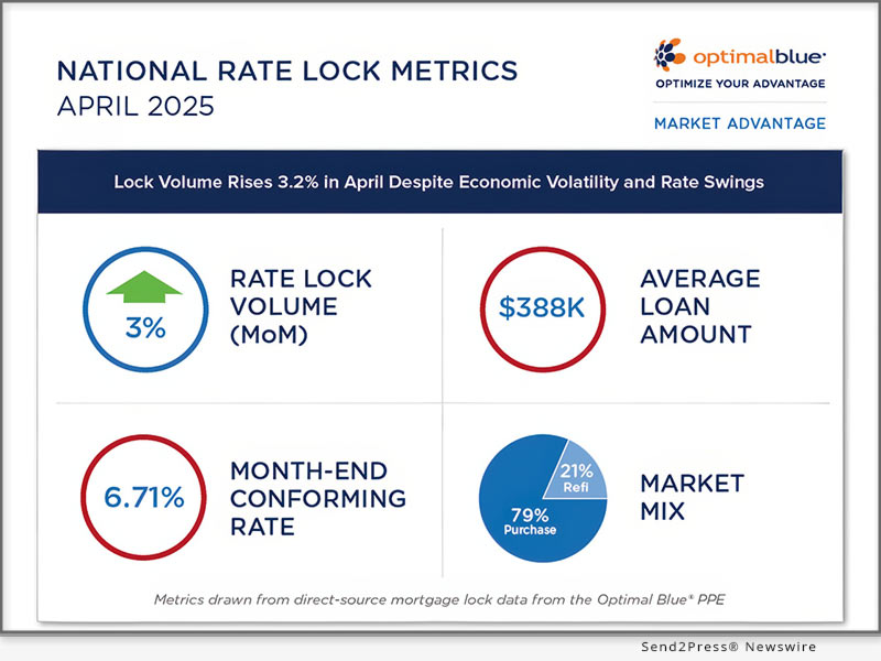 PLANO, Texas, May 13, 2025 (SEND2PRESS NEWSWIRE) — Optimal Blue today released its April 2025 Market Advantage mortgage data report showing total loan lock volume rose 3.2% month-over-month (MoM) as the spring homebuying season progressed, with purchase locks up 7.5% despite ongoing economic pressures.