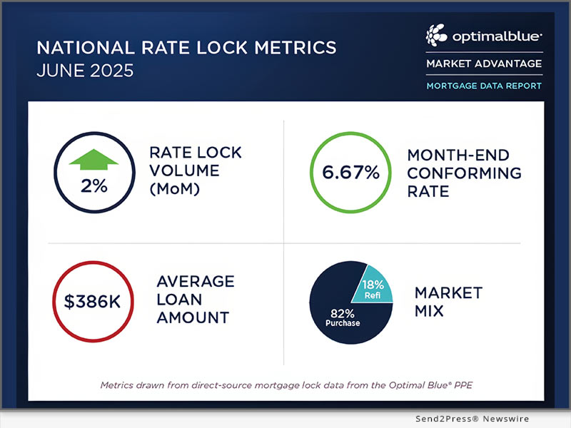 PLANO, Texas, July 8, 2025 (SEND2PRESS NEWSWIRE) — Optimal Blue today released its June 2025 Market Advantage mortgage data report showing total lock volume rose 1.95% month-over-month (MoM), driven by increased refinance activity. Refinance share climbed from 16% to 18% of all locks as rate-and-term refinances jumped 17.4% MoM and 18.4% year-over-year (YoY). Cash-out refinances rose 8.1% from May and nearly 28% YoY. Meanwhile, purchase activity held relatively steady – a better-than-expected result for June, when the spring homebuying season typically tapers off.