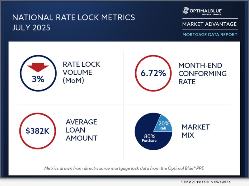 PLANO, Texas, Aug. 12, 2025 (SEND2PRESS NEWSWIRE) — Optimal Blue today released its July 2025 Market Advantage mortgage data report, which found a 3% month-over-month (MoM) drop in overall rate lock volume, led by a nearly 5% drop in purchase activity as affordability remained strained. Mortgage rates rose MoM across all loan types.